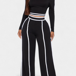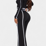 Une proposition contemporaine qui fusionne sensualité et style urbain. Krystelle se distingue par un top off-shoulder aux lignes épurées qui mettent en valeur la silhouette avec féminité, associé à des pantalons à coupe droite ornés de rayures contrastantes qui allongent visuellement la silhouette. Un design destiné à projeter confiance et modernité en toute occasion.