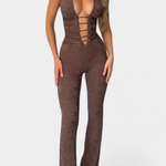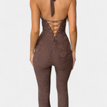 Audacieux, sensuel et avec une touche sophistiquée, le mono Kendra redéfinit la silhouette féminine avec son design profond de halter et ses détails en dentelle florale. Son décolleté prononcé avec des bretelles frontales ajoute une touche provocante, tandis que le dos ouvert avec des lacets ajustables assure un ajustement flatteur et personnalisé. La finition évasée des jambes allonge la silhouette, créant un look imposant et séduisant pour briller lors de toute occasion spéciale.
