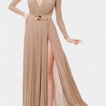 Une silhouette éthérée qui allie sensualité et élégance classique. Raisa se distingue par un décolleté en V profond qui met en valeur, accompagné de manches longues et d'une ceinture qui définit la taille avec distinction. Les plis tombent en cascade, offrant un mouvement fluide et une finition raffinée à chaque pas.