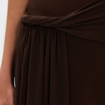 Sensuelle et éthérée, la robe Eranda combine un décolleté off-shoulder tordu avec des drapés qui sculptent la silhouette et ajoutent de la sophistication. Son corps en maille avec des panneaux stratégiques équilibre transparence et couverture, tandis que le ruban en cascade ajoute du mouvement et allonge visuellement la silhouette.