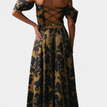 Un design inspiré par l'essence rétro qui combine le romantisme intemporel avec la sophistication moderne. Vinnie se distingue par son audacieux imprimé floral doré sur fond noir, une silhouette sans manches et une longueur maxi qui ajoute fluidité et présence. C'est la pièce parfaite pour briller lors d'occasions où l'élégance est un incontournable.