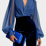 Une silhouette sophistiquée qui allie modernité et féminité avec fluidité. Analisse présente un décolleté en V croisé et des manches aérées qui apportent légèreté, équilibrées par un pantalon large qui met élégamment en valeur la silhouette. Un design élaboré pour briller lors d'occasions spéciales avec une présence confiante et magnétique.