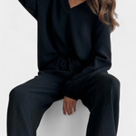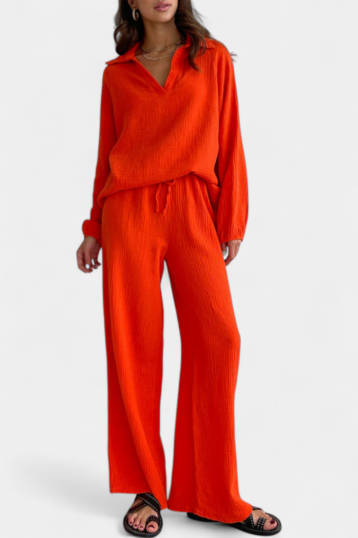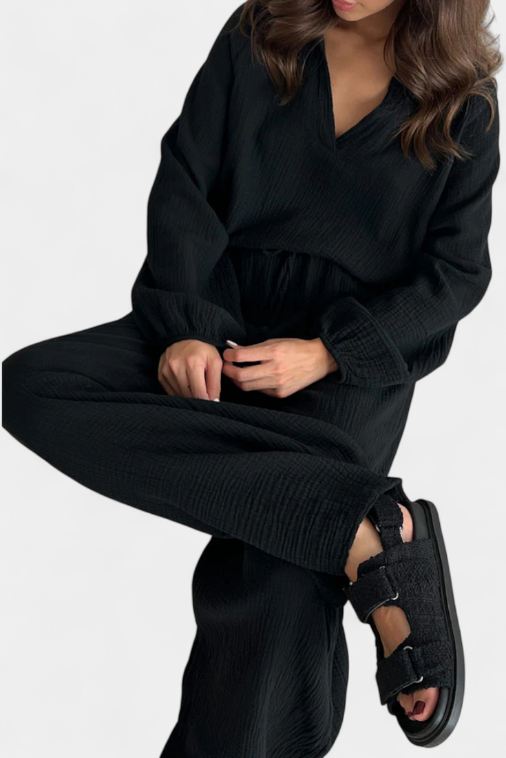 - Design : Décolleté en V, manches longues, pantalons fluides