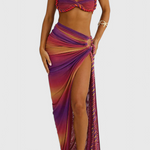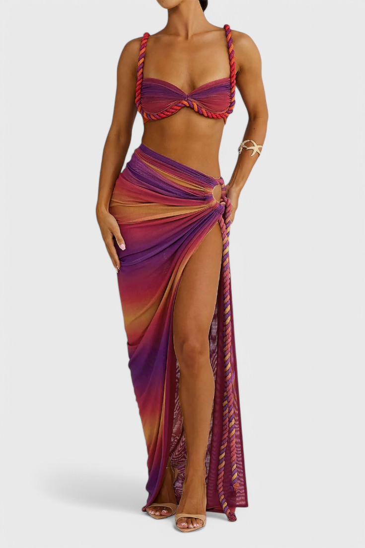 Vibrant et accrocheur, cet ensemble de jupe est conçu pour se démarquer avec son doux chiffon plissé, sa délicate bordure et ses tons dégradés oniriques. Il offre une sensation légère et aérée qui se déplace merveilleusement avec vous. Parfait pour des sorties printanières, des vacances ou des événements au soleil.