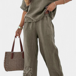 Esthétique bohème avec une touche naturelle. L'ensemble Natalia se distingue par sa silhouette décontractée en lin doux, avec des broderies florales en relief qui ajoutent une ambiance artisanale et féminine.