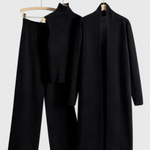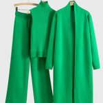 Là où l'élégance intemporelle rencontre le confort quotidien. L'ensemble Mahalia de 3 pièces comprend un long cardigan, un col roulé sans manches et un pantalon à jambes larges, tous fabriqués avec un tissu en tricot ultra doux et respirant. Que vous vous détendiez à la maison, que vous alliez à un brunch ou que vous sortiez le soir, cet ensemble offre une sophistication sans effort avec le confort que vous adorerez.