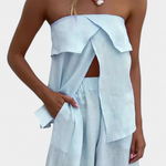 Un look puissant avec une attitude estivale. Oriana combine un top bandeau avec une jupe longue qui présente une fente latérale, créant une silhouette élégante et confiante. Le design minimaliste met subtilement en valeur la silhouette, le rendant idéal pour ceux qui souhaitent se démarquer sans effort. Une option polyvalente qui fonctionne aussi bien pour un dîner au bord de la mer que pour un après-midi en ville.
