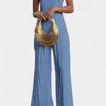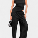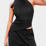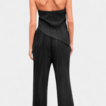 Minimalisme architectural avec texture et mouvement. L'ensemble Pilarica combine un top halter asymétrique avec un dos nu et des pantalons à jambes larges, créant une silhouette allongée avec caractère. Son tissu plissé avec un éclat subtil ajoute dimension et élégance moderne.