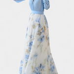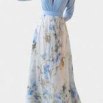 Élégance éthérée avec une touche artistique et moderne. La robe Eliane combine un haut fluide avec un décolleté en V profond et des manches amples, avec une jupe longue ornée d'un délicat imprimé floral aquarelle. Son mouvement enveloppant et sa silhouette raffinée en font une pièce maîtresse pour briller naturellement.