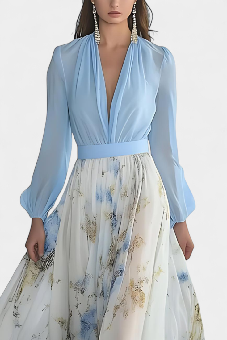 Robe Longue Eliane avec Imprimé Floral et Décolleté en V Profond