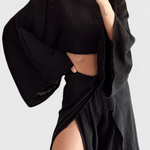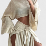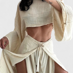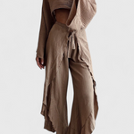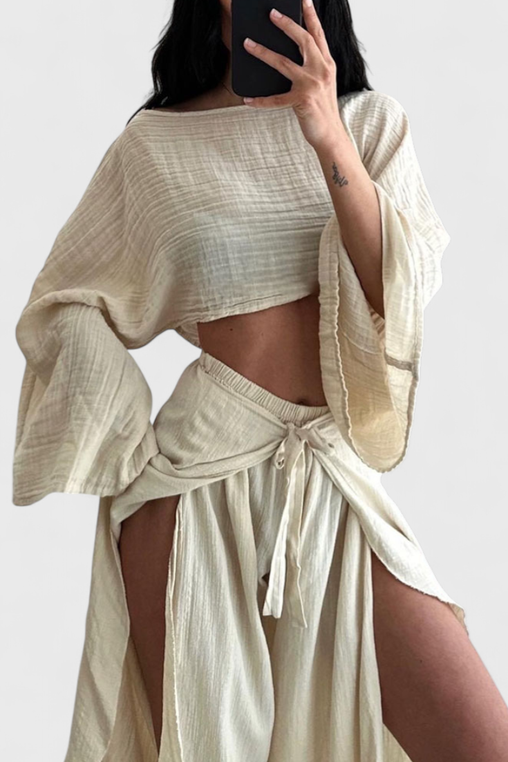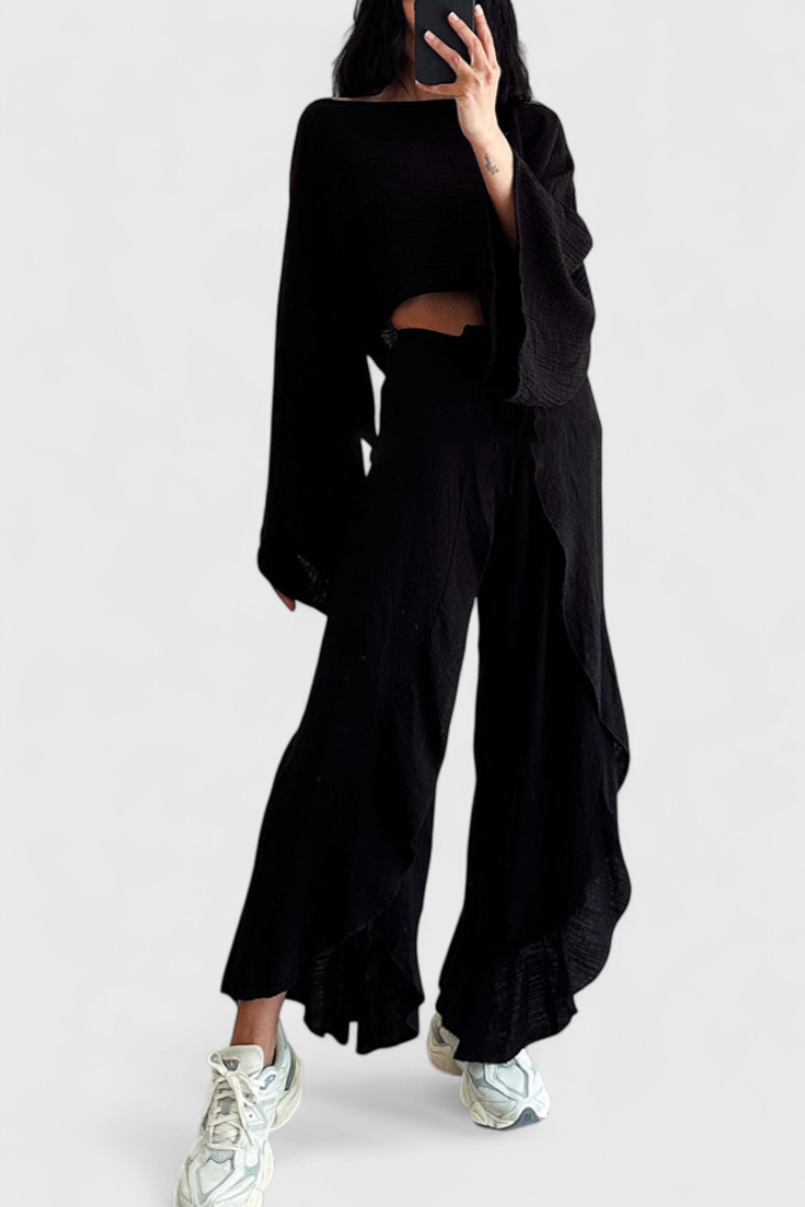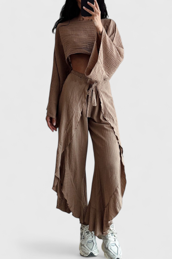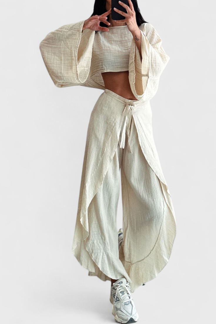 Confort avec une touche audacieuse. L'ensemble Maeva associe un haut court à manches amples avec une ouverture latérale et un pantalon fluide taille haute avec un nœud à la taille, offrant une silhouette moderne et polyvalente. Son tissu léger et sa douce chute en font le choix idéal pour des journées élégantes et décontractées.
