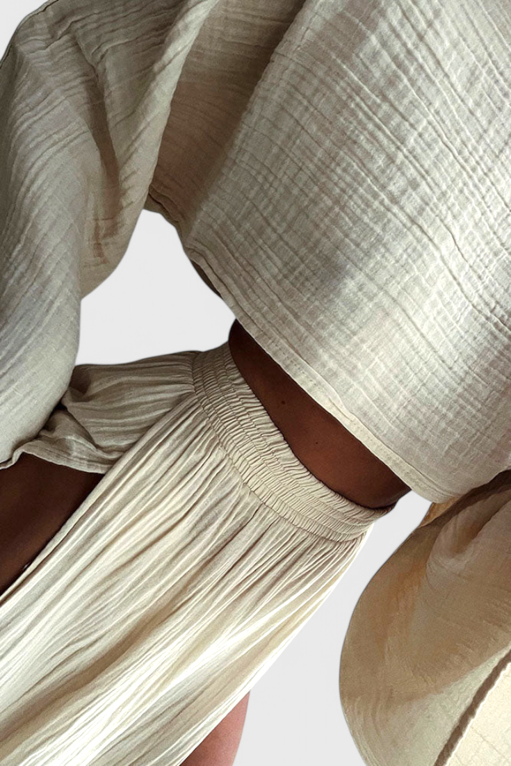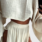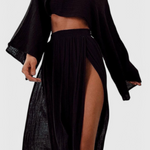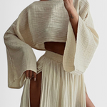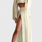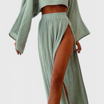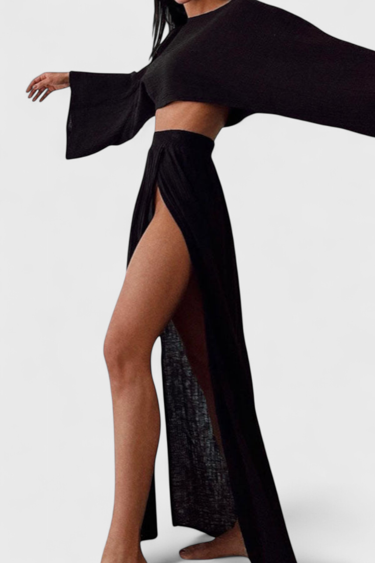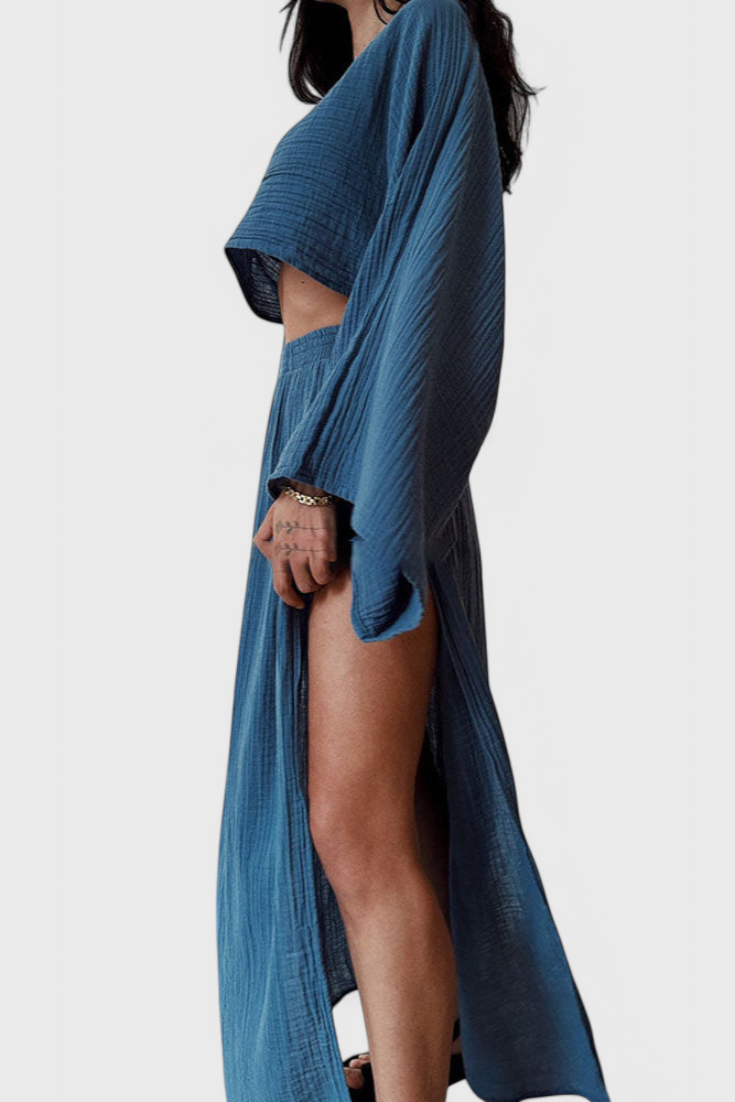 Léger, sophistiqué et conçu pour impressionner—l'ensemble Martha allie un style moderne à un drapé fluide. Son top court aérien et sa jupe à découpe latérale créent un équilibre parfait entre élégance et fraîcheur, le rendant idéal pour les journées ensoleillées ou les soirées spéciales.
