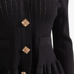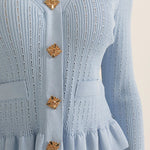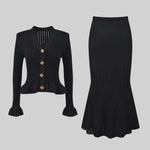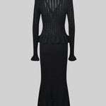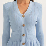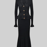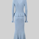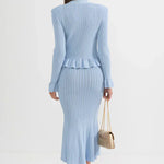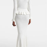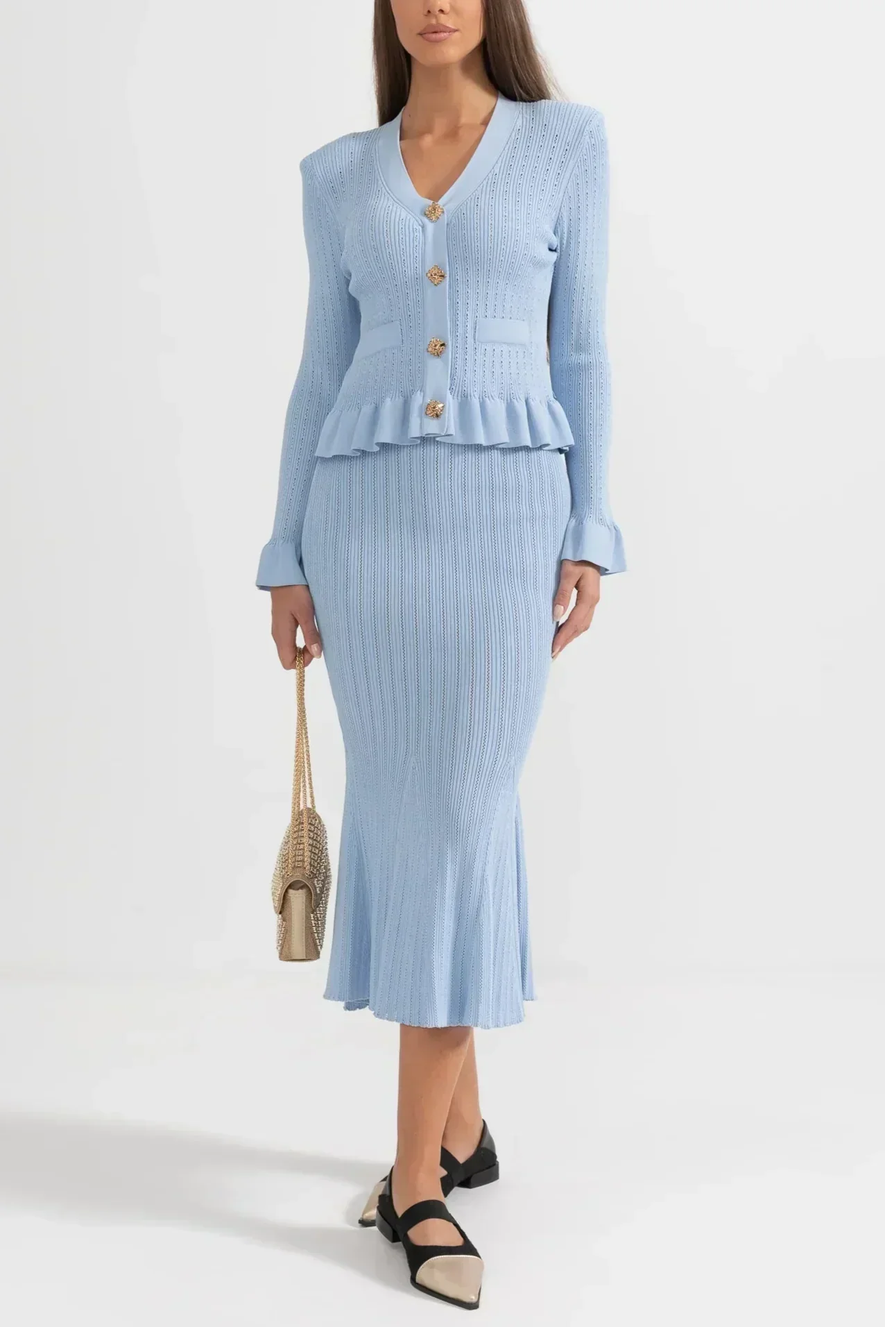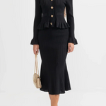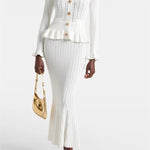 Un ensemble en maille qui allie sophistication et polyvalence à parts égales. Prudence présente un cardigan ajusté avec décolleté en V, de délicates manches à volants et des boutons d'inspiration vintage, associé à une jupe midi taille haute avec une coupe évasée. Ensemble, ils créent une silhouette fluide et élégante, parfaite pour s'adapter à différents moments de la journée avec un style impeccable.