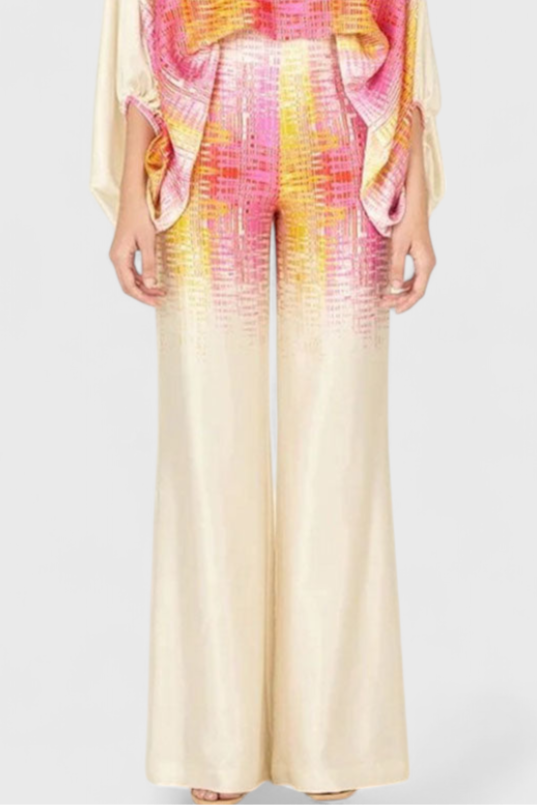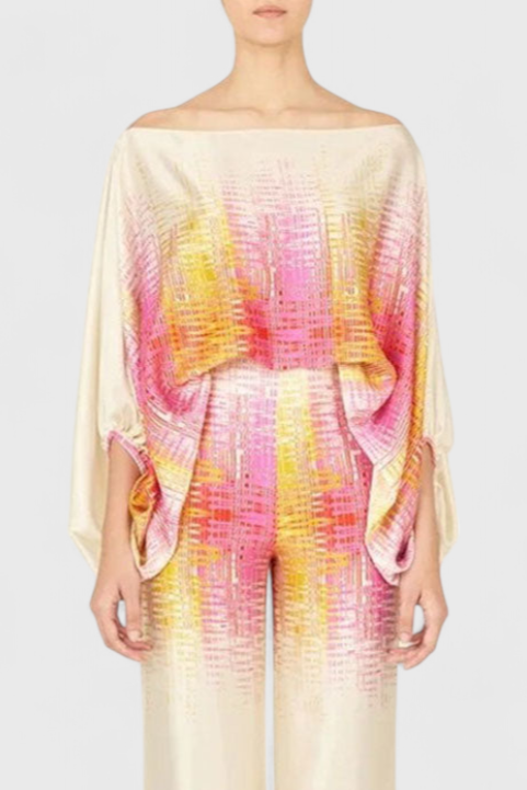 L'ensemble Sybella combine un haut off-the-shoulder avec des manches bouffantes et des pantalons à jambe large avec un imprimé artistique. Conçu pour offrir une silhouette fluide avec personnalité, il est parfait pour les journées ensoleillées, les escapades décontractées ou les réunions élégantes.