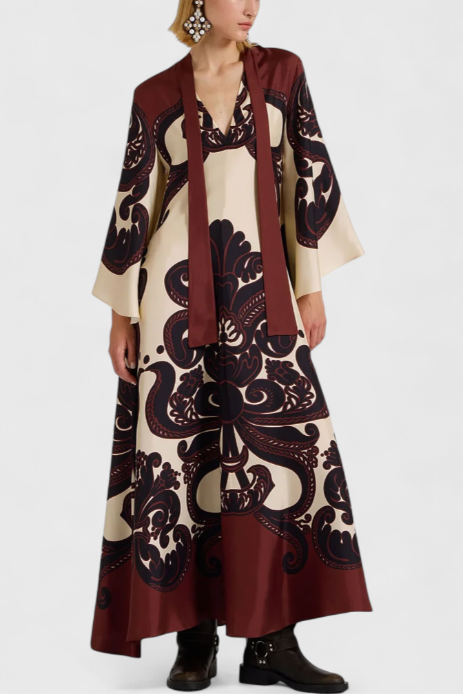 Fluidité artistique avec un design qui exhale l'élégance. La robe Maritza se distingue par sa silhouette enveloppante, son col montant avec un nœud à l'arrière et un délicat imprimé de grenadille, créant une esthétique sophistiquée et assurée. Parfaite pour les moments où le style est au centre de l'attention.