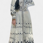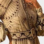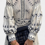 Fusionnant le charme vintage avec l'élégance inspirée du folklore, la Robe Soria présente un imprimé noir sur crème et des broderies artisanales. Avec son col mandarin, son devant entièrement boutonné et ses manches bouffantes saisissantes, cette pièce de style bohème crée une silhouette ajustée et élégante pour les romantiques modernes.