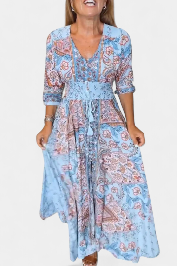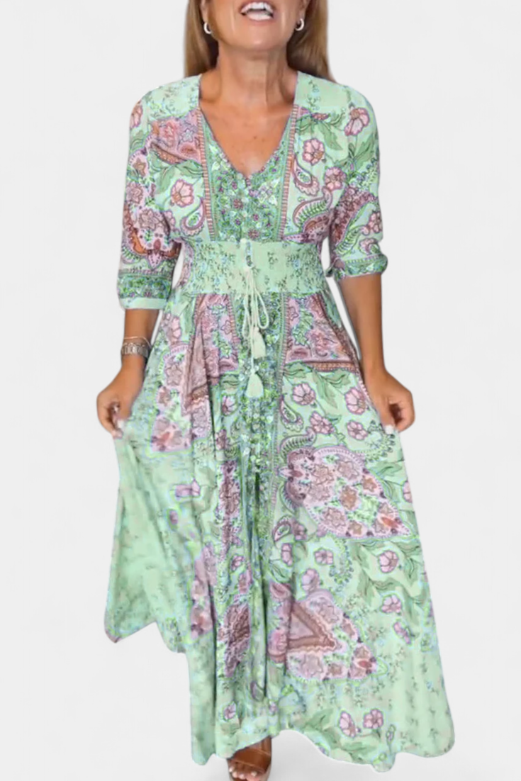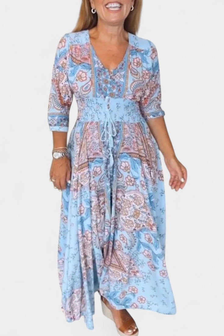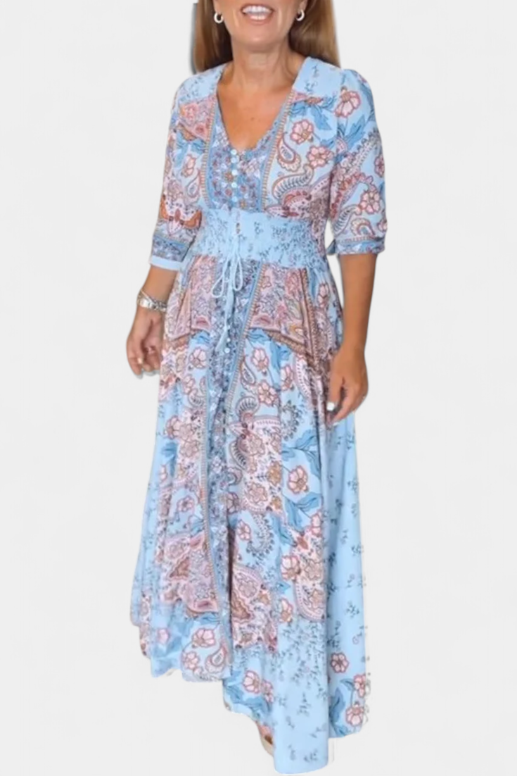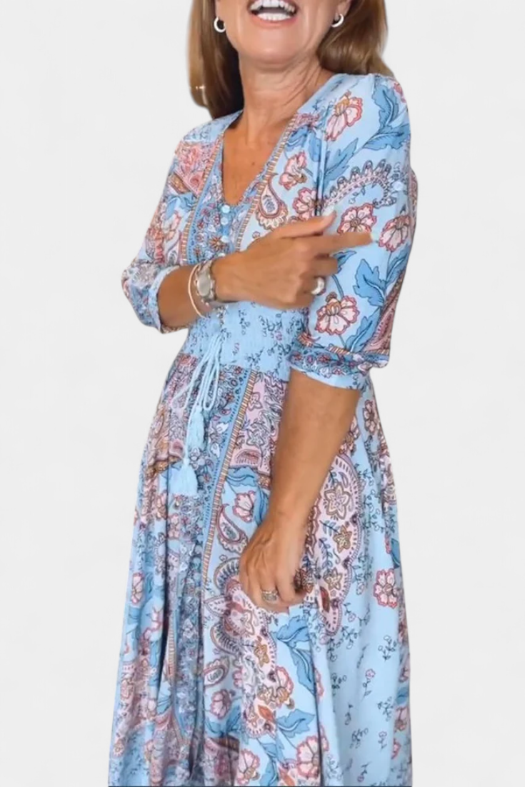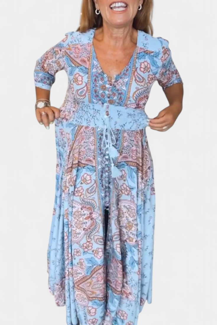 Rafraîchissante et polyvalente, la robe Dunya est conçue pour vous accompagner avec style pendant les journées chaudes. Son décolleté en V, ses manches ¾ et ses détails de boutons créent une silhouette flatteuse, tandis que le cordon ajustable met naturellement en valeur votre silhouette. Idéale pour les vacances, les sorties décontractées ou toute occasion ensoleillée.