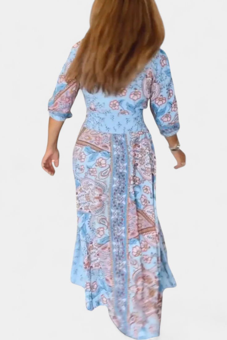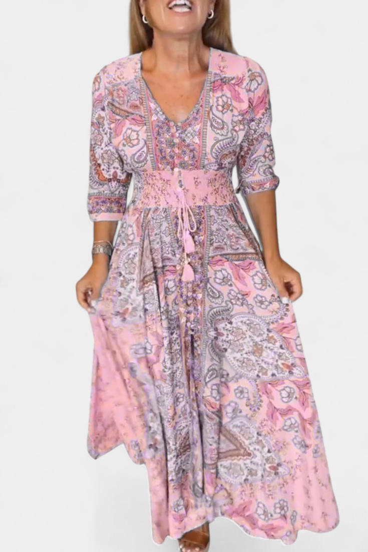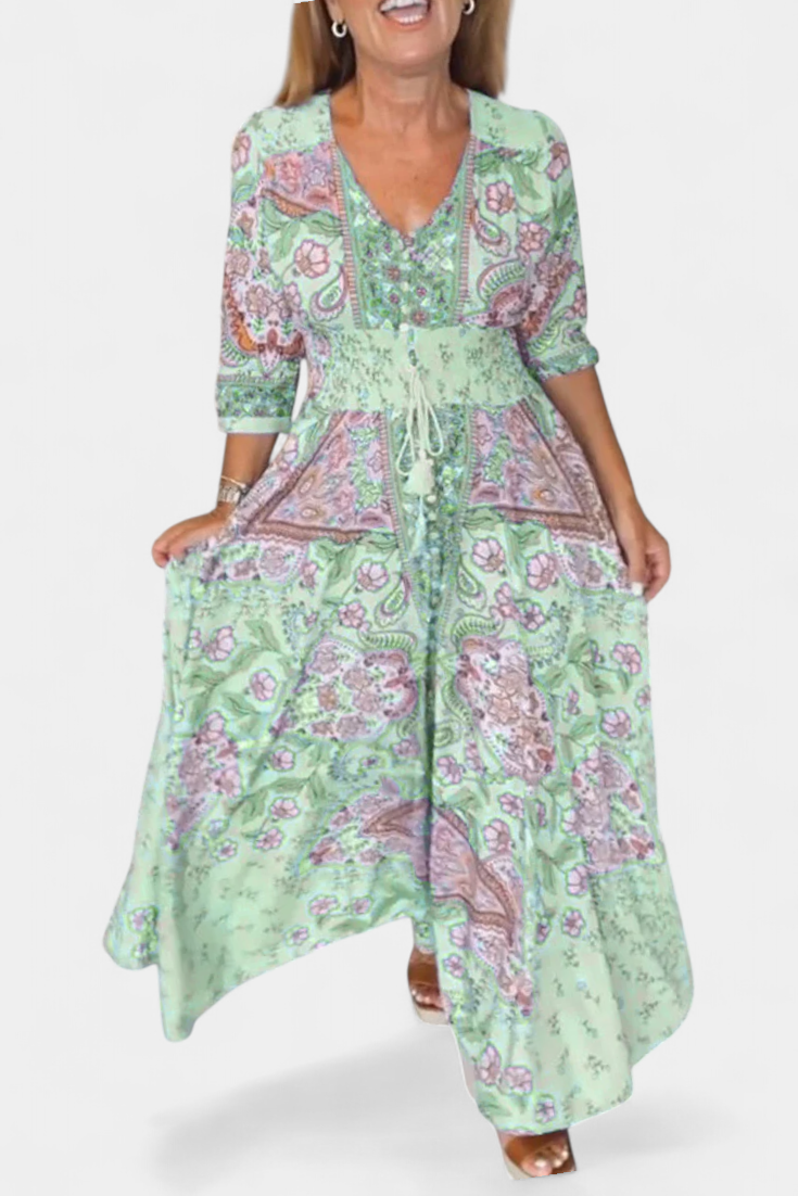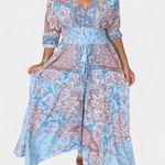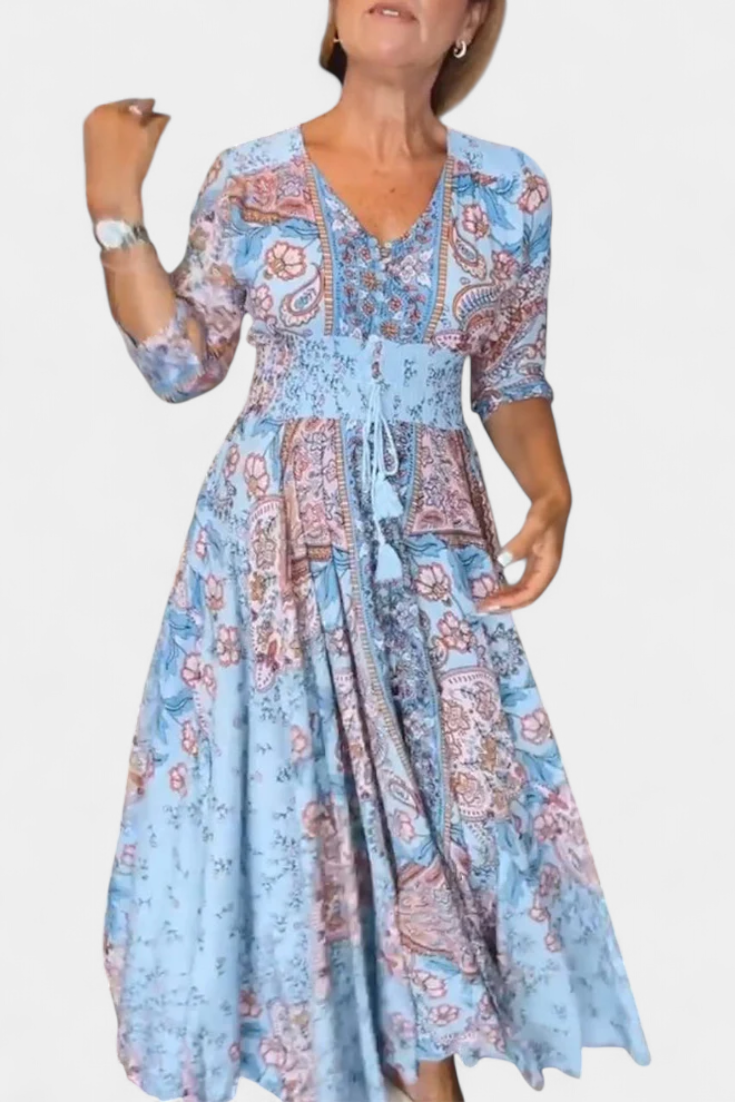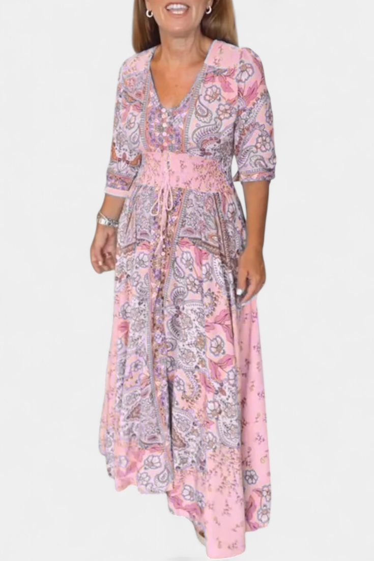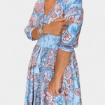Rafraîchissante et polyvalente, la robe Dunya est conçue pour vous accompagner avec style pendant les journées chaudes. Son décolleté en V, ses manches ¾ et ses détails de boutons créent une silhouette flatteuse, tandis que le cordon ajustable met naturellement en valeur votre silhouette. Idéale pour les vacances, les sorties décontractées ou toute occasion ensoleillée.