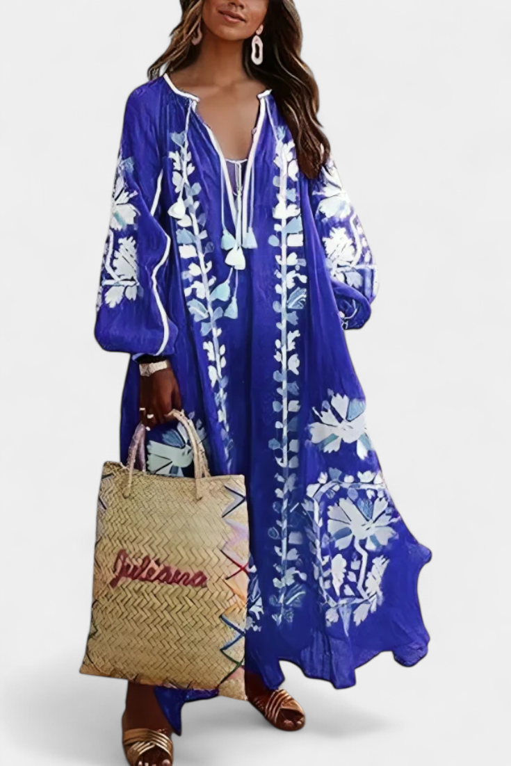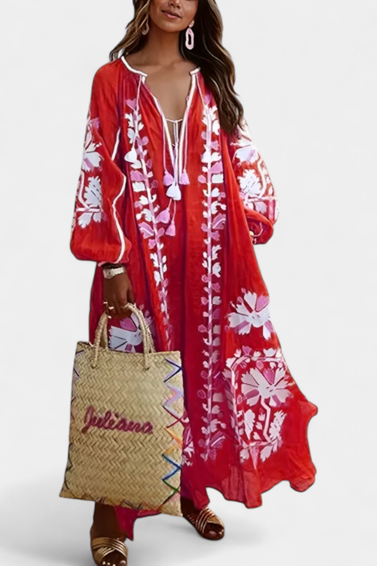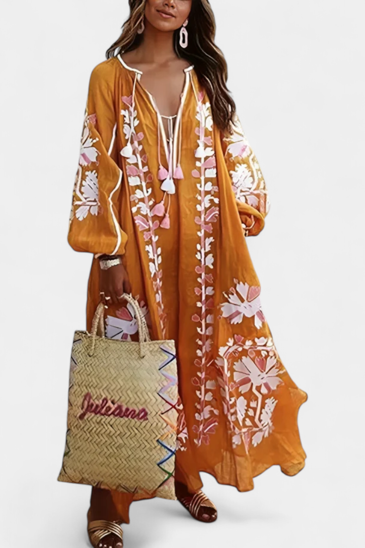 Avec une silhouette décontractée et des détails artisanaux, la robe Alessia est synonyme de charme naturel et de liberté de mouvement. La broderie florale contraste avec le fond vibrant, tandis que les longues manches bouffantes et le décolleté à lacets créent un équilibre parfait entre confort et style bohème.