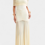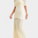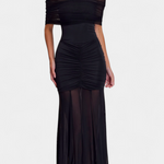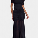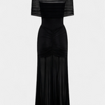 Hypnotique et sophistiquée, la robe Alodia évoque le charme des nuits spéciales avec son mélange de glamour et de drame. Le décolleté bateau avec délicate maille et le froncé à la taille mettent en valeur la silhouette, tandis que la longue jupe fluide ajoute un mouvement éthéré. Avec un corset doublé pour plus de confort, c'est une pièce conçue pour briller à chaque occasion.
