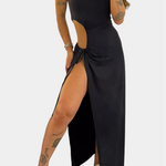 La robe Teuta allie une silhouette sculptée à des détails fonctionnels et modernes. Son décolleté sans bretelles met élégamment en valeur les épaules, tandis que le bodysuit intégré offre soutien et structure. Le nœud latéral ajustable définit la taille avec une touche ludique, et la haute fente ajoute de la fluidité avec une touche dramatique.