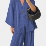 Eli allie simplicité et style dans un ensemble polyvalent idéal pour les climats chauds. Le top à col en V ajoute une touche décontractée et flatteuse, tandis que les pantalons à coupe confortable complètent un look moderne et fonctionnel. Parfait pour des journées de loisirs, des promenades ou des escapades relaxantes.