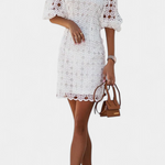 Fraîcheur méditerranéenne avec une touche coquette et charmante. Cette robe en dentelle florale ajustée célèbre élégamment la silhouette, tandis que les manches bouffantes et le décolleté en cœur rehaussent le style avec une touche romantique et contemporaine.