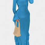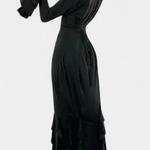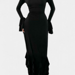 Une silhouette dramatique qui allie élégance et mouvement. Calissa présente une coupe longue et ajustée qui met en valeur la silhouette, accompagnée de manches évasées qui ajoutent une touche théâtrale et un air sophistiqué. Les volants en cascade le long de l'ourlet apportent du dynamisme, créant un effet fluide et distinctif à chaque pas.