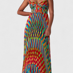Une œuvre d'art en mouvement. La robe Janis fusionne un imprimé géométrique peint à la main avec une silhouette fluide en A pour un effet captivant. Son décolleté halter en cœur et les détails froncés à la taille ajoutent une définition féminine et une touche de sophistication raffinée.