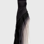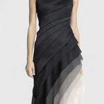Légère sophistication avec un jeu de tons qui attire tous les regards. La robe Angela allie un élégant col bateau sans manches à des couches de mousseline fluide. Son dégradé de noir à ivoire ajoute de la profondeur visuelle et une présence raffinée pour des occasions spéciales.