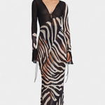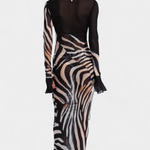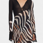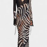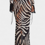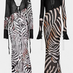 Audacieuse et magnétique, la robe Taisia allie un imprimé zèbre à des transparences stratégiques qui suggèrent sans trop révéler. Son décolleté profond avec lacets, ses manches évasées et sa silhouette fluide en font une pièce iconique pour un look de nuit plein de caractère.