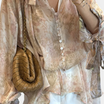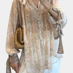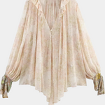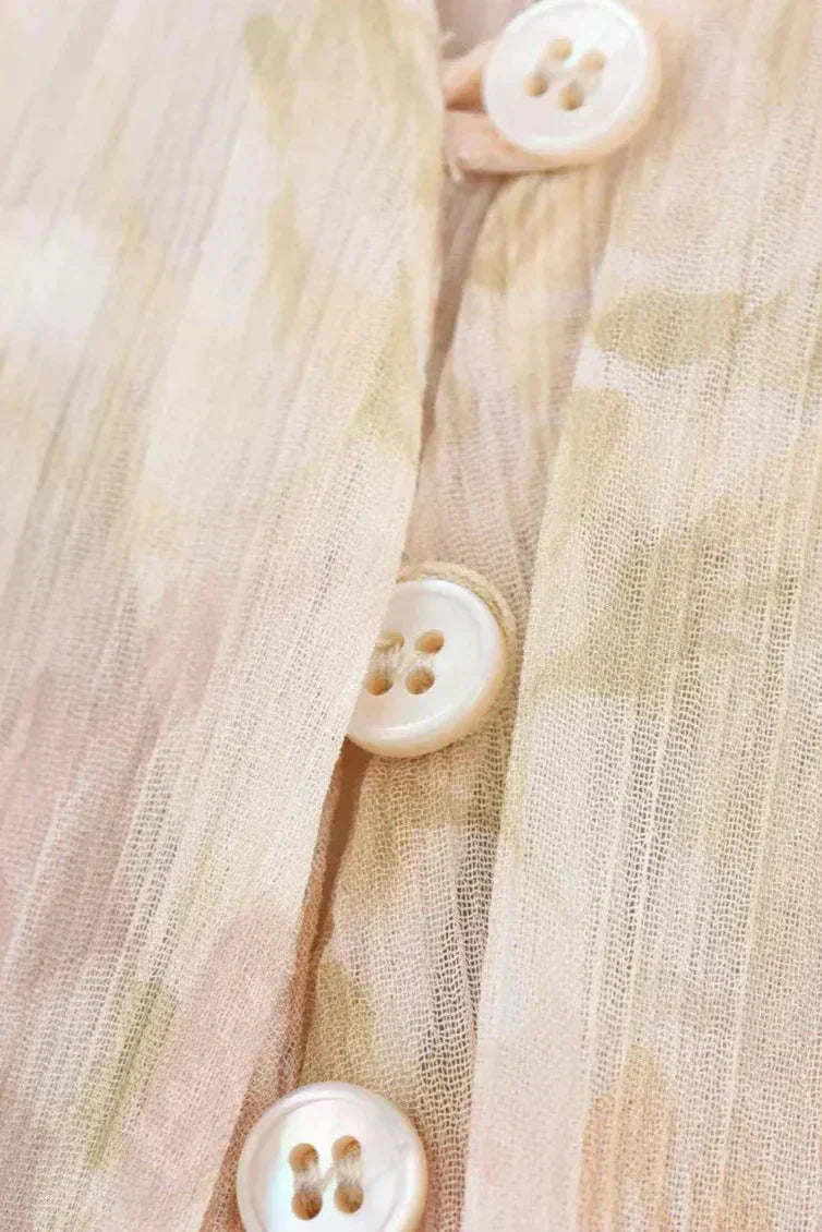 Laissez-vous porter par la brise avec la Blouse Dunes Murmurantes. Avec un imprimé pastel de rêve, des manches avec un nœud romantique et de délicats boutons en nacre, ce vêtement léger est parfait pour les aventures sous le soleil et les journées insouciantes.