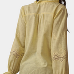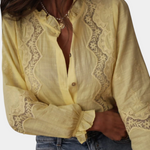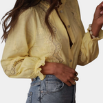 Laissez entrer le soleil avec la Blouse en Dentelle Catarina, un mélange romantique de douceur féminine et de bohème charmante sans effort. Cette pièce de rêve présente de délicats panneaux en dentelle, des manches légèrement bouffantes et un devant boutonné flatteur. La teinte jaune chaude illumine votre look tandis que l'intriqué broderie ajoute une touche d'âme vintage.