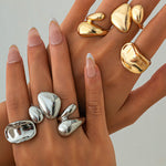 Moderne et expressif, cet ensemble d'anneaux en métal irréguliers présente des formes organiques et des lignes sculpturales. Chaque pièce ajoute une touche artistique à votre look, parfaite pour être empilée ou portée seule et mettre en valeur votre style unique.