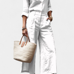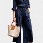 Confort avec style à chaque mouvement. L'ensemble Sabina est fabriqué en tissu doux avec du spandex qui offre élasticité et fluidité à votre journée. La chemise à coupe décontractée et les pantalons capri à jambes larges créent une silhouette moderne et légère, parfaite pour les moments d'activité ou de détente avec une touche d'élégance.