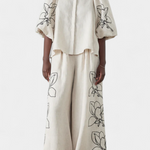 Décontracté mais sophistiqué, l'ensemble Helen allie confort naturel et look élégant et contemporain. Sa blouse à manches bouffantes et ses pantalons amples, fabriqués à partir d'un mélange de coton et de lin, créent une silhouette fluide et fraîche, parfaite pour les journées chaudes. Le motif floral ajoute une touche joyeuse et moderne, en faisant une tenue polyvalente qui fonctionne aussi bien pour des moments décontractés que pour des occasions spéciales.