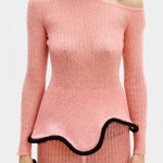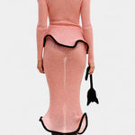 Une proposition chic qui allie modernité et féminité. Stormi se distingue par son top en côtes asymétrique et ses délicats bords volants en contraste, apportant une touche ludique mais sophistiquée. La jupe midi coordonnée, avec une finition semi-translucide et des détails miroités, complète un ensemble équilibré qui combine audace et élégance à parts égales.